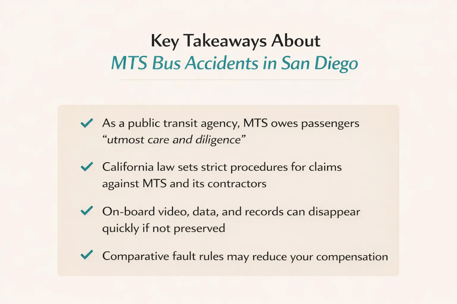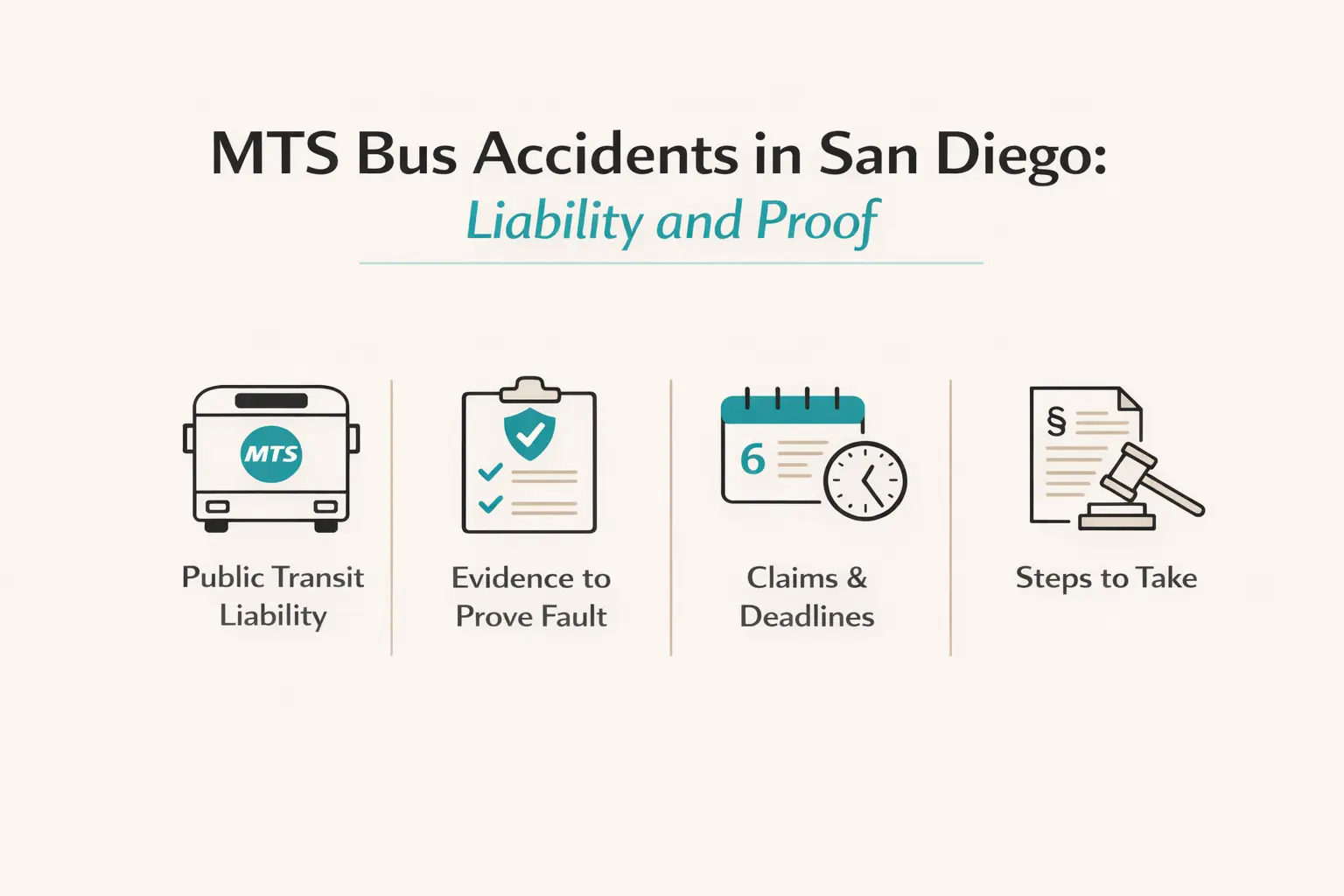 This article explains how liability is evaluated, how to prove what happened, and what steps to take so you can make informed decisions about your rights after an MTS bus accident in San Diego.